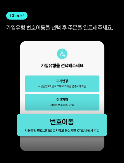 ② 가입유형에서 사용 중인 번호 그대로 유지하고 통신사만 변경하는 번호이동을 선택한 후 주문을 완료합니다.